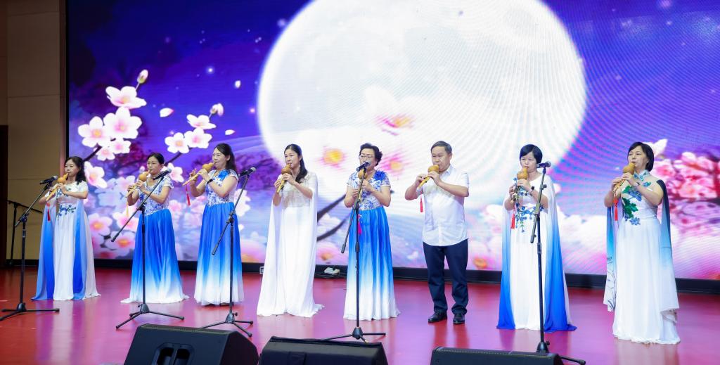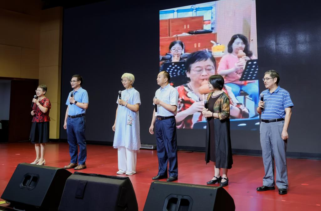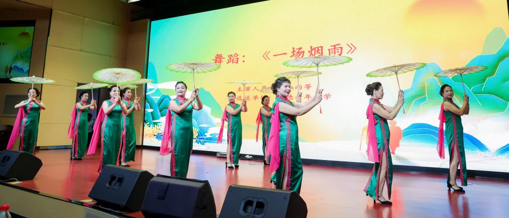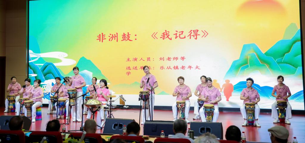 在热烈的掌声中,精彩的文艺汇演正式开始。随着热情洋溢、节奏轻快的乐曲,非洲鼓表演《我记得》、配乐诗朗诵《幸福的退休生活》、粤曲独唱《江南春梦》等节目依次登场,现场喜庆祥和、气氛热烈。二胡重奏《奔驰在千里草原》旋律激昂,节奏明快,仿佛让人置身于广袤无垠的草原之上,两位离退休老师现场挥墨泼毫,为现场观众献上重阳节的温暖祝福。紧接着,吉他弹唱《苹果香》《萱草花》、葫芦丝演奏《彩云追月》《起航》、古典舞《红日升》、诗朗诵《读中国》轮番登场。活动尾声,全体人员合唱《歌唱祖国》,将现场气氛推向高潮。