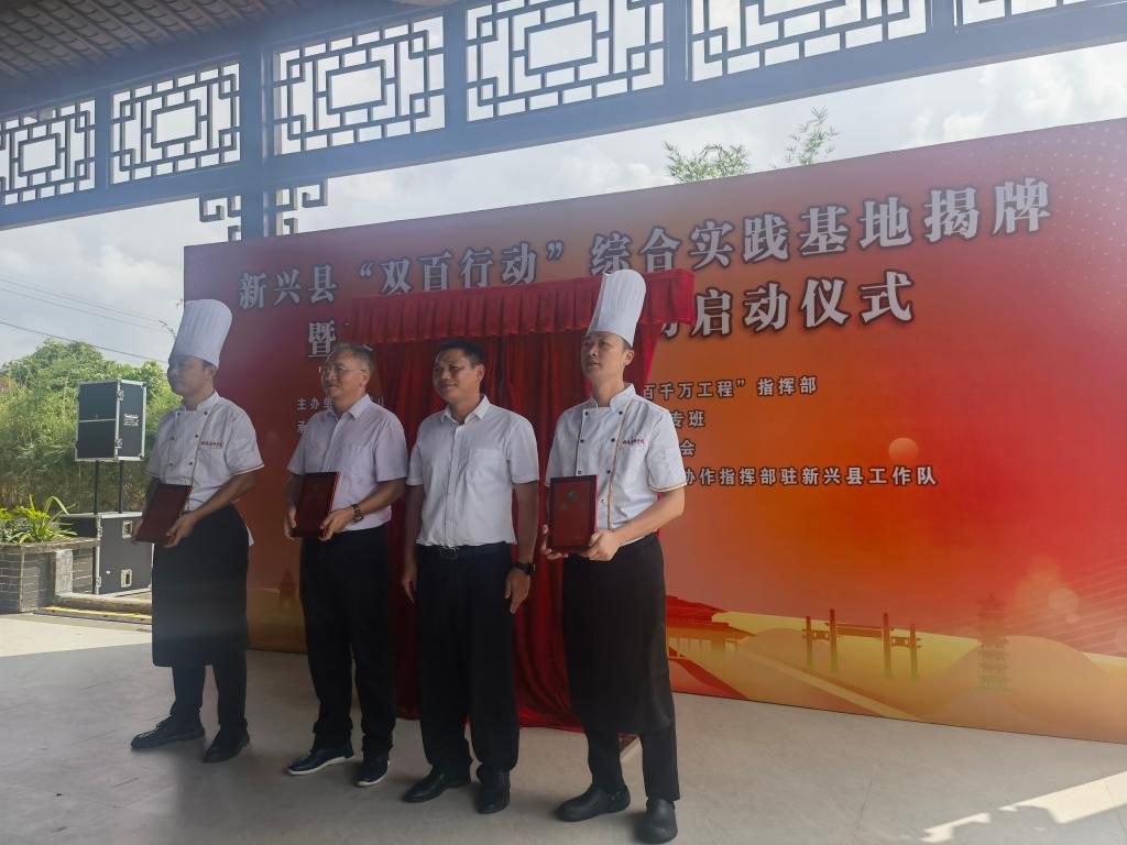 仪式上,领导嘉宾共同为新兴县“双百行动”综合实践基地、科技小院、培训基地揭牌,向入驻天堂镇乡村振兴人才驿站的“粤菜师傅”培训导师颁发聘任证书。