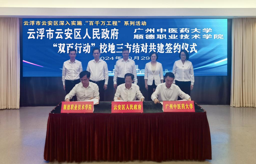 10月29日,广州中医药大学、冰球突破mg正规官网、云浮市云安区人民政府“双百行动”校地三方结对共建签约仪式在云安区会议中心举行,深入学习贯彻党的二十届三中全会精神和习近平总书记视察广东重要讲话、重要指示精神,落实省委、省政府工作部署,进一步深化校地合作,推动“双百行动”走深走实,为加力提速推进“百千万工程”注入新活力、新动能。